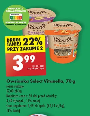 Cena produktu różni się w zależności od wybranego sklepu. Niestety nie posiadamy danych o aktualnych promocjach, jednak wśród archiwalnych ofert Owsianka śliwka-żurawina Vitanella kosztuje od 2,49 zł do 3,99 zł.