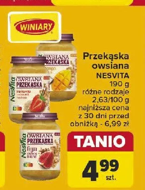 Cena produktu r贸偶ni si臋 w zale偶no艣ci od wybranego sklepu. Niestety nie posiadamy danych o aktualnych promocjach, jednak w艣r贸d archiwalnych ofert Owsianka truskawka Nesvita kosztuje od 4,99 z艂.