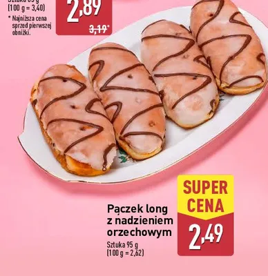 Cena produktu r贸偶ni si臋 w zale偶no艣ci od wybranego sklepu. Niestety nie posiadamy danych o aktualnych promocjach, jednak w艣r贸d archiwalnych ofert P膮czek long z nadzieniem orzechowym kosztuje od 2,49 z艂.