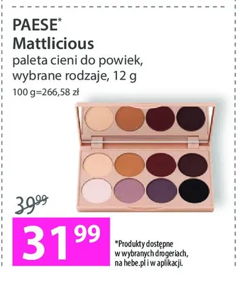 Cena produktu r贸偶ni si臋 w zale偶no艣ci od wybranego sklepu. Niestety nie posiadamy danych o aktualnych promocjach, jednak w艣r贸d archiwalnych ofert Paleta cieni mattlicious Paese kosztuje od 31,99 z艂.