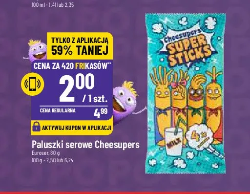 Cena produktu r贸偶ni si臋 w zale偶no艣ci od wybranego sklepu. Niestety nie posiadamy danych o aktualnych promocjach, jednak w艣r贸d archiwalnych ofert Paluszki z sera mozzarella Cheesupers super sticks kosztuje od 2 z艂.