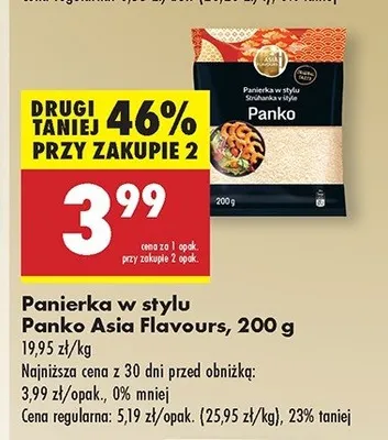 Cena produktu r贸偶ni si臋 w zale偶no艣ci od wybranego sklepu. Niestety nie posiadamy danych o aktualnych promocjach, jednak w艣r贸d archiwalnych ofert Panierka panko Asia flavours kosztuje od 3,99 z艂 do 5,99 z艂.