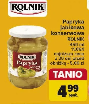 Cena produktu r贸偶ni si臋 w zale偶no艣ci od wybranego sklepu. Niestety nie posiadamy danych o aktualnych promocjach, jednak w艣r贸d archiwalnych ofert Papryka jab艂kowa Rolnik kosztuje od 4,99 z艂.