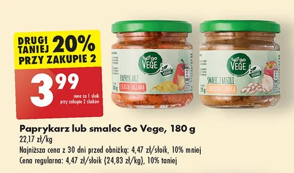 Cena produktu r贸偶ni si臋 w zale偶no艣ci od wybranego sklepu. Niestety nie posiadamy danych o aktualnych promocjach, jednak w艣r贸d archiwalnych ofert Paprykarz Govege kosztuje od 2,33 z艂 do 3,99 z艂.