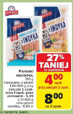 Cena produktu r贸偶ni si臋 w zale偶no艣ci od wybranego sklepu. Niestety nie posiadamy danych o aktualnych promocjach, jednak w艣r贸d archiwalnych ofert Par贸wki z indyka klasyczne Indykpol kosztuje od 3,99 z艂 do 4,29 z艂.