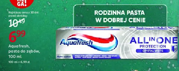 Cena produktu r贸偶ni si臋 w zale偶no艣ci od wybranego sklepu. Niestety nie posiadamy danych o aktualnych promocjach, jednak w艣r贸d archiwalnych ofert Pasta do z臋b贸w crystal white Aquafresh all-in-one protection kosztuje od 6,99 z艂 do 8,79 z艂.