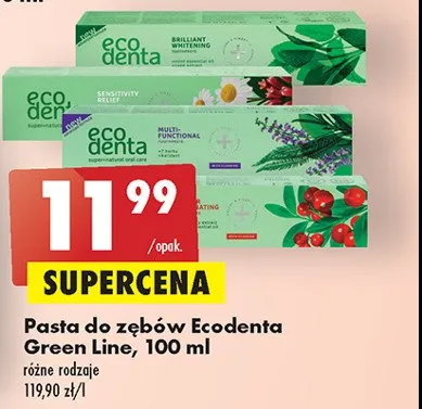 Cena produktu różni się w zależności od wybranego sklepu. Niestety nie posiadamy danych o aktualnych promocjach, jednak wśród archiwalnych ofert Pasta do zębów wybielająca z olejkiem miętowym ekstraktem szałwiowym i kalidentem Ecodenta kosztuje od 9,99 zł do 11,99 zł.
