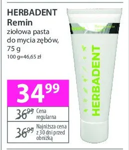 Cena produktu r贸偶ni si臋 w zale偶no艣ci od wybranego sklepu. Niestety nie posiadamy danych o aktualnych promocjach, jednak w艣r贸d archiwalnych ofert Pasta remin Herbadent kosztuje od 34,99 z艂.