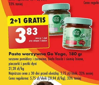 Cena produktu różni się w zależności od wybranego sklepu. Niestety nie posiadamy danych o aktualnych promocjach, jednak wśród archiwalnych ofert Pasta warzywna z suszonymi pomidorami i żurawiną Govege kosztuje od 3,19 zł do 5,48 zł.