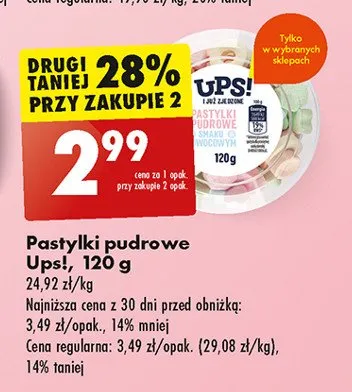 Cena produktu r贸偶ni si臋 w zale偶no艣ci od wybranego sklepu. Niestety nie posiadamy danych o aktualnych promocjach, jednak w艣r贸d archiwalnych ofert Pastylki pudrowe Ups! kosztuje od 2,99 z艂.