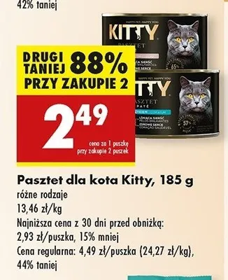 Cena produktu r贸偶ni si臋 w zale偶no艣ci od wybranego sklepu. Niestety nie posiadamy danych o aktualnych promocjach, jednak w艣r贸d archiwalnych ofert Pasztet rybny Kitty excellence kosztuje od 2,49 z艂 do 2,99 z艂.