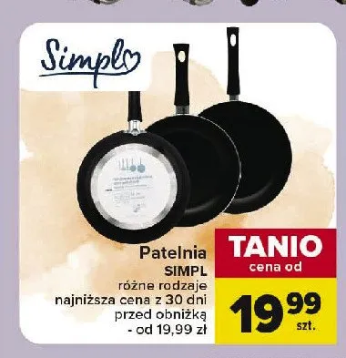 Cena produktu r贸偶ni si臋 w zale偶no艣ci od wybranego sklepu. Produkt Patelnia 20 cm Simpl mo偶esz kupi膰 w promocji ju偶 od 35 z艂 do 49,99 z艂. Najta艅sza oferta, jak膮 mamy w naszej bazie jest z sieci Biedronka. Patelnia 20 cm Simpl kosztuje aktualnie 35 z艂. Zobacz ofert臋