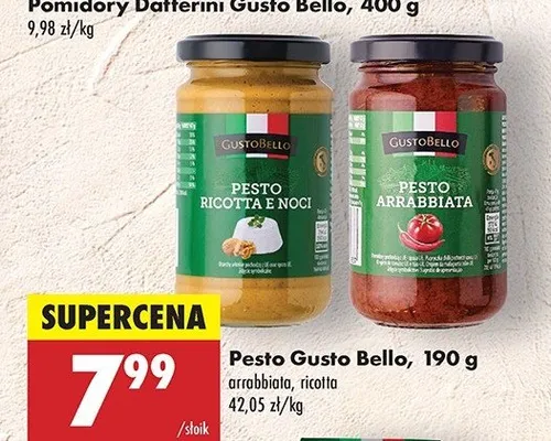 Cena produktu r贸偶ni si臋 w zale偶no艣ci od wybranego sklepu. Niestety nie posiadamy danych o aktualnych promocjach, jednak w艣r贸d archiwalnych ofert Pesto ricotta e noci Gustobello kosztuje od 7,99 z艂.