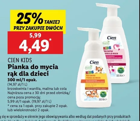 Cena produktu r贸偶ni si臋 w zale偶no艣ci od wybranego sklepu. Niestety nie posiadamy danych o aktualnych promocjach, jednak w艣r贸d archiwalnych ofert Pianka do r膮k malinowe lato Cien kids kosztuje od 3,99 z艂 do 4,79 z艂.