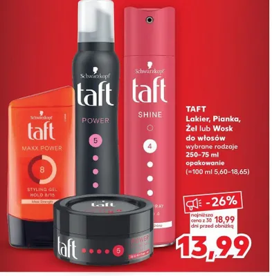 Cena produktu r贸偶ni si臋 w zale偶no艣ci od wybranego sklepu. Niestety nie posiadamy danych o aktualnych promocjach, jednak w艣r贸d archiwalnych ofert Pianka do w艂os贸w Taft power cashmere touch kosztuje od 8,98 z艂 do 14,99 z艂.