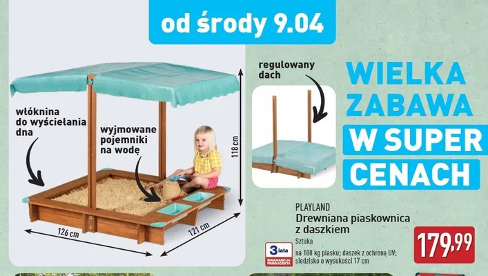 Cena produktu r贸偶ni si臋 w zale偶no艣ci od wybranego sklepu. Produkt Piaskownica z daszkiem Playland mo偶esz kupi膰 w promocji ju偶 od 179,99 z艂. Najta艅sza oferta, jak膮 mamy w naszej bazie jest z sieci Aldi. Piaskownica z daszkiem Playland kosztuje aktualnie 179,99 z艂. Zobacz ofert臋
