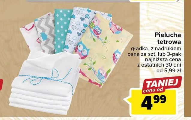 Cena produktu r贸偶ni si臋 w zale偶no艣ci od wybranego sklepu. Niestety nie posiadamy danych o aktualnych promocjach, jednak w艣r贸d archiwalnych ofert Pielucha tetrowa g艂adka kosztuje od 4,99 z艂.