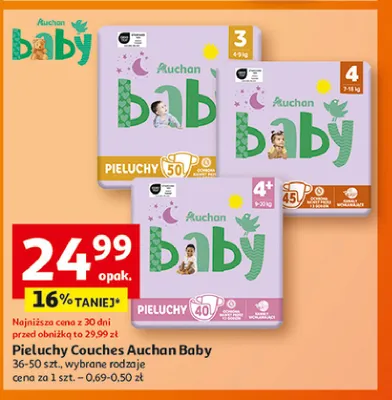 Cena produktu r贸偶ni si臋 w zale偶no艣ci od wybranego sklepu. Niestety nie posiadamy danych o aktualnych promocjach, jednak w艣r贸d archiwalnych ofert Pieluchy 4+ Auchan baby kosztuje od 24,99 z艂 do 29,99 z艂.