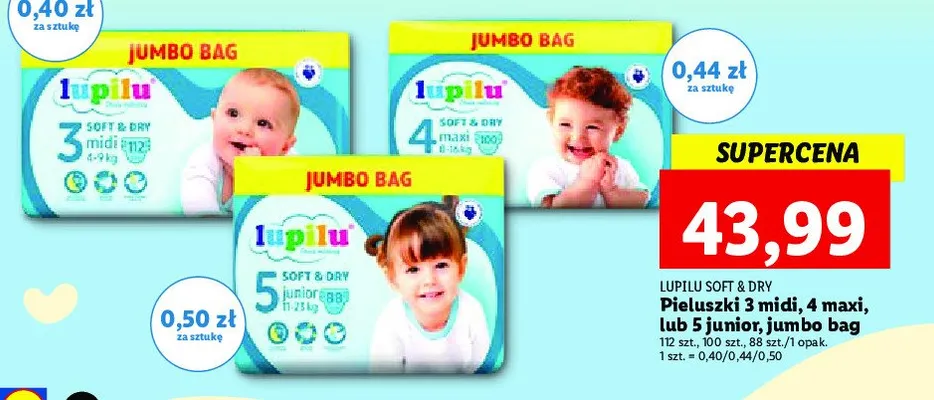Cena produktu r贸偶ni si臋 w zale偶no艣ci od wybranego sklepu. Niestety nie posiadamy danych o aktualnych promocjach, jednak w艣r贸d archiwalnych ofert Pieluchy junior 5 Lupilu soft & dry kosztuje od 43,99 z艂.