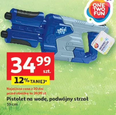 Cena produktu r贸偶ni si臋 w zale偶no艣ci od wybranego sklepu. Produkt Pistolet na wod臋 59 cm One two fun mo偶esz kupi膰 w promocji ju偶 od 7,99 z艂. Najta艅sza oferta, jak膮 mamy w naszej bazie jest z sieci Auchan. Pistolet na wod臋 59 cm One two fun kosztuje aktualnie 7,99 z艂. Zobacz ofert臋