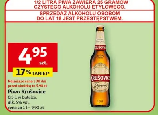 Zastanawiasz si臋, gdzie kupi膰 i ile kosztuje produkt Piwo Krusovice imperial? Regularnie sprawdzamy, czy jest promocja na ten produkt w Biedronka, Lidl, Kaufland, Auchan, Netto, Makro i innych sklepach. Aktualnie posiadamy 1 ofert臋 promocyjn膮 na ten produkt. Ceny zaczynaj膮 si臋 od 4,99z艂!