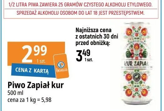 Zastanawiasz si臋, gdzie kupi膰 i ile kosztuje produkt Piwo KUR ZAPIA艁? Regularnie sprawdzamy, czy jest promocja na ten produkt w Biedronka, Lidl, Kaufland, Auchan, Netto, Makro i innych sklepach. Aktualnie posiadamy 14 ofert promocyjnych na ten produkt. Ceny zaczynaj膮 si臋 od 2,59z艂!