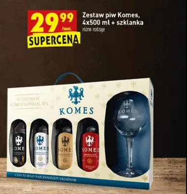 Cena produktu różni się w zależności od wybranego sklepu. Niestety nie posiadamy danych o aktualnych promocjach, jednak wśród archiwalnych ofert Piwo + pokal Komes porter bałtycki + komes russian imperial stout + komes potrójny złoty + komes poczwórny bursztynowy kosztuje od 29,99 zł.