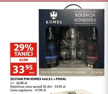 Cena produktu różni się w zależności od wybranego sklepu. Niestety nie posiadamy danych o aktualnych promocjach, jednak wśród archiwalnych ofert Piwo + pokal Komes potrójny złoty + komes podwójny ciemny + komes porter bałtycki + komes poczwórny bursztynowy kosztuje od 29,99 zł do 39,99 zł.