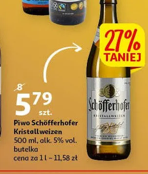 Cena produktu r贸偶ni si臋 w zale偶no艣ci od wybranego sklepu. Niestety nie posiadamy danych o aktualnych promocjach, jednak w艣r贸d archiwalnych ofert Piwo Schofferhofer kristallweizen kosztuje od 5,79 z艂.