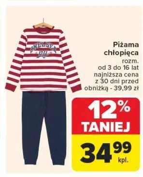 Cena produktu różni się w zależności od wybranego sklepu. Niestety nie posiadamy danych o aktualnych promocjach, jednak wśród archiwalnych ofert Piżama chłopięca 3-16 lat kosztuje od 34,99 zł.