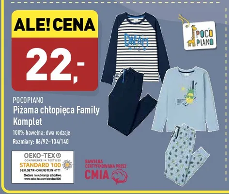 Cena produktu różni się w zależności od wybranego sklepu. Niestety nie posiadamy danych o aktualnych promocjach, jednak wśród archiwalnych ofert Piżama chłopięca family 86/92-134/140 Pocopiano kosztuje od 22 zł.