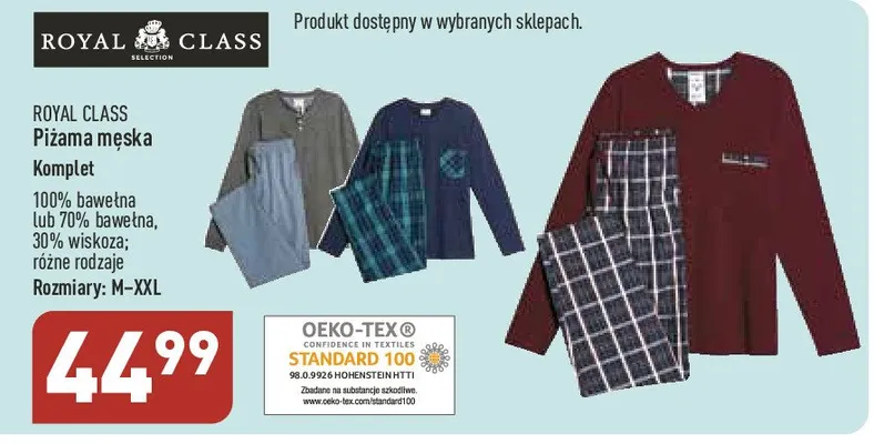 Cena produktu różni się w zależności od wybranego sklepu. Produkt Piżama męska m-xxl Royal class Royal class selection możesz kupić w promocji już od 29,99 zł. Najtańsza oferta, jaką mamy w naszej bazie jest z sieci Biedronka. Piżama męska m-xxl Royal class Royal class selection kosztuje aktualnie 29,99 zł. Zobacz ofertę