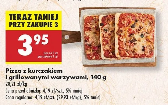 Cena produktu r贸偶ni si臋 w zale偶no艣ci od wybranego sklepu. Niestety nie posiadamy danych o aktualnych promocjach, jednak w艣r贸d archiwalnych ofert Pizza z kurczakiem i grillowanymi warzywami kosztuje od 3,95 z艂.