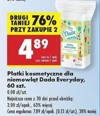 Cena produktu r贸偶ni si臋 w zale偶no艣ci od wybranego sklepu. Niestety nie posiadamy danych o aktualnych promocjach, jednak w艣r贸d archiwalnych ofert P艂atki kosmetyczne Dada everyday kosztuje od 4,89 z艂 do 4,99 z艂.