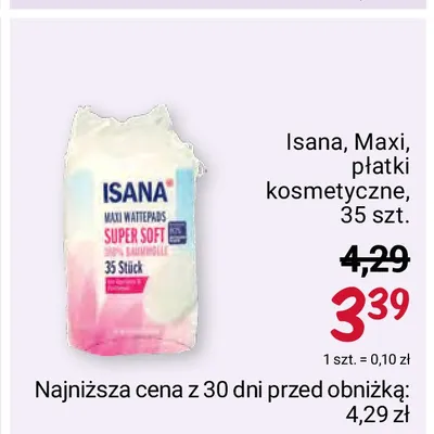 Cena produktu r贸偶ni si臋 w zale偶no艣ci od wybranego sklepu. Niestety nie posiadamy danych o aktualnych promocjach, jednak w艣r贸d archiwalnych ofert P艂atki kosmetyczne maxi Isana kosztuje od 2,99 z艂 do 3,39 z艂.