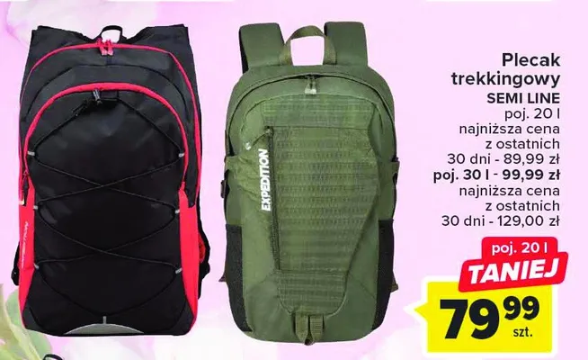 Cena produktu r贸偶ni si臋 w zale偶no艣ci od wybranego sklepu. Produkt Plecak trekkingowy 30 l Semi line mo偶esz kupi膰 w promocji ju偶 od 129,99 z艂. Najta艅sza oferta, jak膮 mamy w naszej bazie jest z sieci Auchan. Plecak trekkingowy 30 l Semi line kosztuje aktualnie 129,99 z艂. Zobacz ofert臋