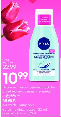 Cena produktu różni się w zależności od wybranego sklepu. Niestety nie posiadamy danych o aktualnych promocjach, jednak wśród archiwalnych ofert Płyn delikatny do demakijażu oczu Nivea visage demakijaż kosztuje od 8,98 zł do 10,99 zł.