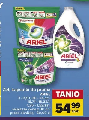 Cena produktu r贸偶ni si臋 w zale偶no艣ci od wybranego sklepu. Niestety nie posiadamy danych o aktualnych promocjach, jednak w艣r贸d archiwalnych ofert P艂yn do prania color & style Ariel kosztuje od 54,99 z艂.