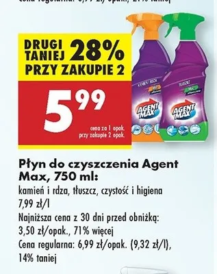 Cena produktu r贸偶ni si臋 w zale偶no艣ci od wybranego sklepu. Niestety nie posiadamy danych o aktualnych promocjach, jednak w艣r贸d archiwalnych ofert P艂yn do usuwania t艂uszczu Agent max kosztuje od 5,58 z艂 do 5,99 z艂.