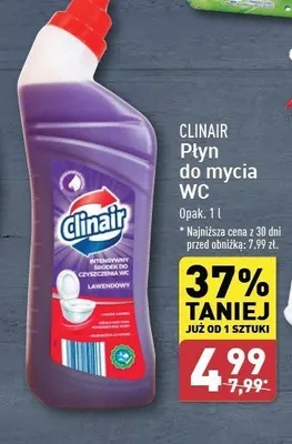 Cena produktu r贸偶ni si臋 w zale偶no艣ci od wybranego sklepu. Niestety nie posiadamy danych o aktualnych promocjach, jednak w艣r贸d archiwalnych ofert P艂yn do wc lawendowy Clinair kosztuje od 3,99 z艂 do 4,99 z艂.