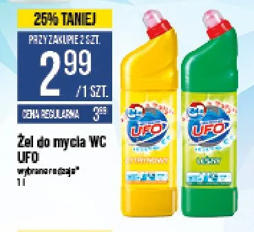 Cena produktu r贸偶ni si臋 w zale偶no艣ci od wybranego sklepu. Niestety nie posiadamy danych o aktualnych promocjach, jednak w艣r贸d archiwalnych ofert P艂yn do wc le艣ny Ufo kosztuje od 2,99 z艂 do 3,99 z艂.