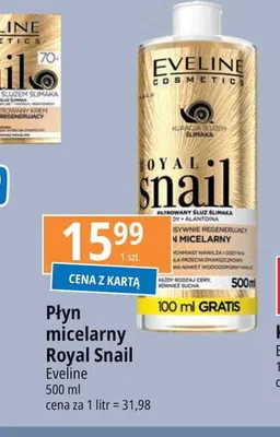 Cena produktu różni się w zależności od wybranego sklepu. Niestety nie posiadamy danych o aktualnych promocjach, jednak wśród archiwalnych ofert Płyn micelarny regenerujący ze śluzem ślimaka Eveline royal snail kosztuje od 9,99 zł do 15,99 zł.