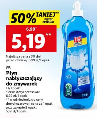 Cena produktu r贸偶ni si臋 w zale偶no艣ci od wybranego sklepu. Niestety nie posiadamy danych o aktualnych promocjach, jednak w艣r贸d archiwalnych ofert P艂yn nab艂yszczaj膮cy do zmywarki W5 kosztuje od 4,5 z艂 do 5,99 z艂.