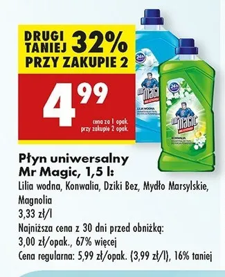 Cena produktu r贸偶ni si臋 w zale偶no艣ci od wybranego sklepu. Niestety nie posiadamy danych o aktualnych promocjach, jednak w艣r贸d archiwalnych ofert P艂yn uniwersalny dziki bez Mr magic kosztuje od 4,99 z艂.
