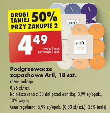 Cena produktu r贸偶ni si臋 w zale偶no艣ci od wybranego sklepu. Niestety nie posiadamy danych o aktualnych promocjach, jednak w艣r贸d archiwalnych ofert Podgrzewacze zapachowe pomara艅cza Aril kosztuje od 3,99 z艂 do 4,49 z艂.