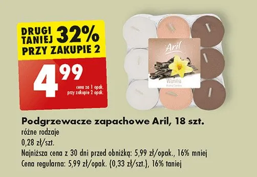 Cena produktu r贸偶ni si臋 w zale偶no艣ci od wybranego sklepu. Niestety nie posiadamy danych o aktualnych promocjach, jednak w艣r贸d archiwalnych ofert Podgrzewacze zapachowe wanilia Aril kosztuje od 3,99 z艂 do 4,99 z艂.