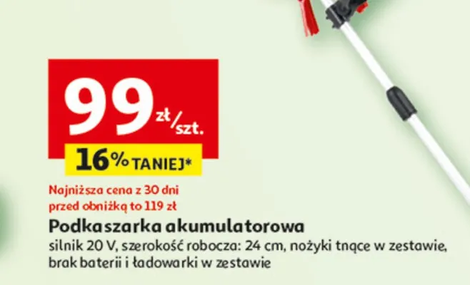 Zastanawiasz si臋, gdzie kupi膰 i ile kosztuje produkt Podkaszarka akumulatorowa? Regularnie sprawdzamy, czy jest promocja na ten produkt w Biedronka, Lidl, Kaufland, Auchan, Netto, Makro i innych sklepach. Aktualnie posiadamy 1 ofert臋 promocyjn膮 na ten produkt. Ceny zaczynaj膮 si臋 od 199,99z艂!