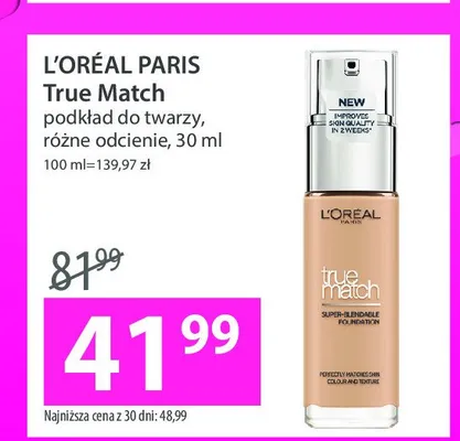 Cena produktu r贸偶ni si臋 w zale偶no艣ci od wybranego sklepu. Niestety nie posiadamy danych o aktualnych promocjach, jednak w艣r贸d archiwalnych ofert Podk艂ad L'oreal true match super blendable foundation kosztuje od 41,99 z艂.