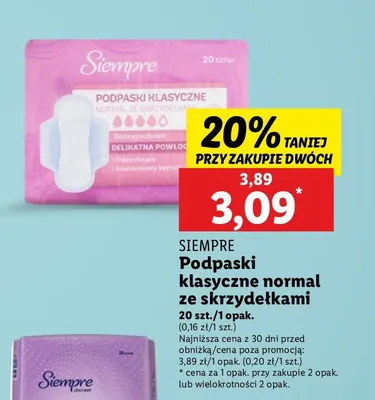 Cena produktu r贸偶ni si臋 w zale偶no艣ci od wybranego sklepu. Niestety nie posiadamy danych o aktualnych promocjach, jednak w艣r贸d archiwalnych ofert Podpaski klasyczne ze skrzyde艂kami Siempre kosztuje od 1,85 z艂 do 3,09 z艂.