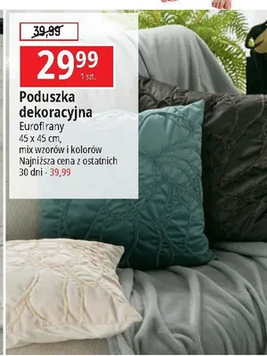 Cena produktu r贸偶ni si臋 w zale偶no艣ci od wybranego sklepu. Niestety nie posiadamy danych o aktualnych promocjach, jednak w艣r贸d archiwalnych ofert Poduszka 45 x 45 cm EUROFIRANY kosztuje od 29,99 z艂.